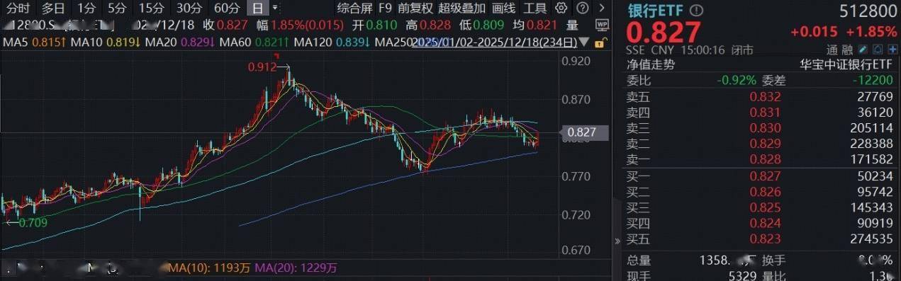 一、【银行全线上行,工农建交涨超2%,规模最大银行ETF(512800)放量收复3条均线,趋势反转?】