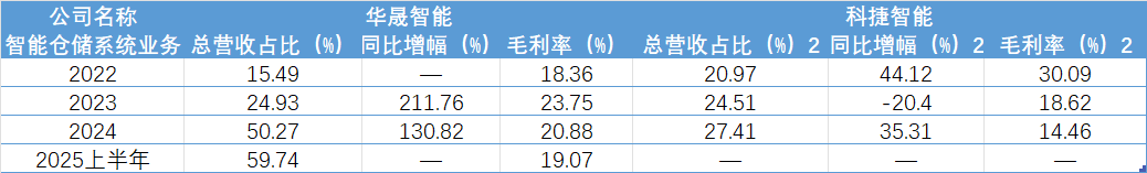 华晟智能、科捷智能智能仓储业务业绩、毛利率对比。数据来源:招股说明书、Wind 制图:界面新闻