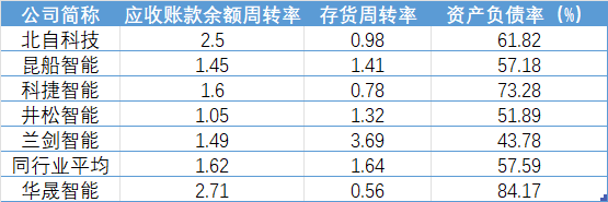 招股书显示,华晟智能报告期内应收账款及合同资产账面价值分别为1.1亿元、1.75亿元、2.16亿元和2.53亿元,占同期营业收入的比分别为33.23%、27.56%、29.61%和36.23%;应收账款周转率分别为2.40次、4.03次、3.42次、2.71次。