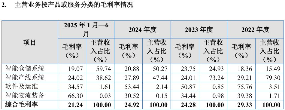 华晟智能的另一核心业务智能仓储物流系统业绩占比不断提升,由2022年的15.49%增长至今年上半年的59.74%,但该业务毛利率却呈现波动下滑态势,报告期内分别为18.36%、23.75%、20.88%、19.07%。