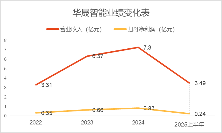 华晟智能2022年至2024年实现营业收入3.31亿元、6.37亿元、7.3亿元,净利润由3481.87万元增长至8287.19万元。但2025年上半年出现“增收不增利”态势,营业收入3.49亿元相当于2024年全年的47.8%,但净利润2361.67万元仅相当于2024年全年的28.5%。