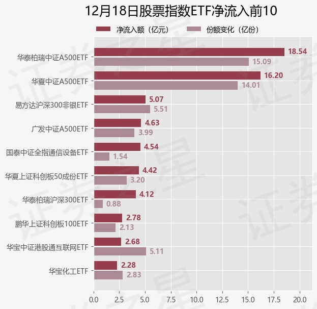 当日有173只股票指数ETF基金出现资金净流入,其中净流入排首位的是华泰柏瑞中证A500ETF(563360),份额增加了15.09亿份,净流入额为18.54亿元。
