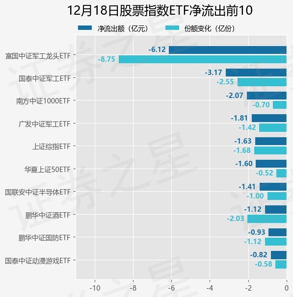 当日有177只股票指数ETF基金出现资金净流出,其中净流出排首位的是富国中证军工龙头ETF(512710),份额减少了8.75亿份,净流出额为6.12亿元。