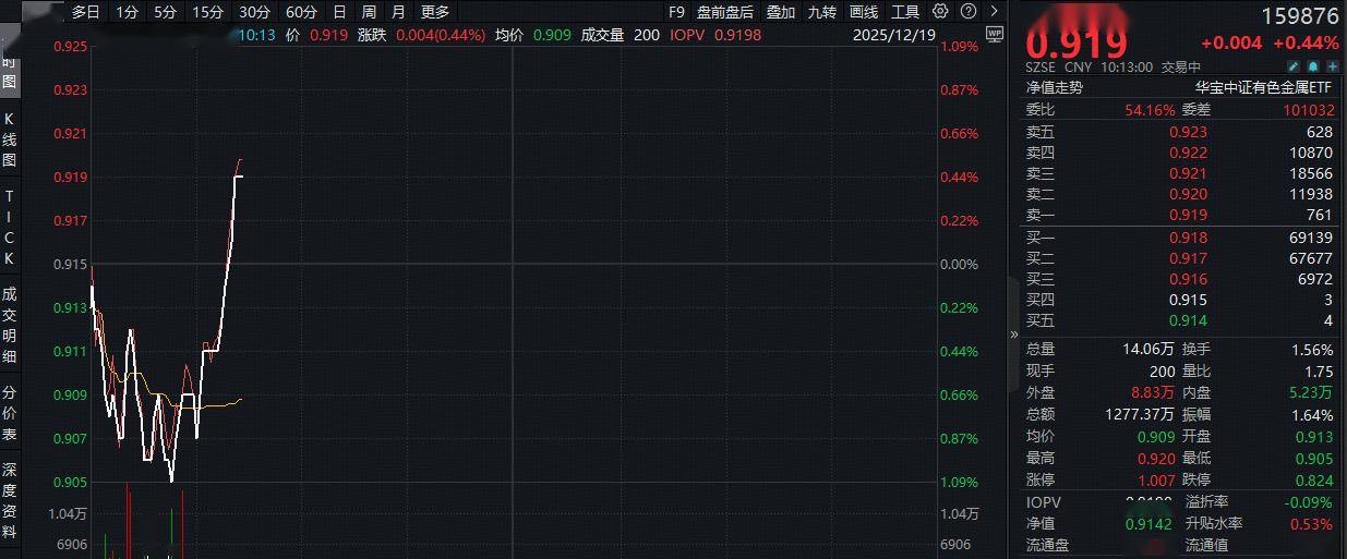 今日(12月19日)早盘,有色金属板块从水面下强势拉升翻红,同标的指数规模最大的有色ETF华宝(159876)场内价格现涨0.44%,当前站在所有均线上方。