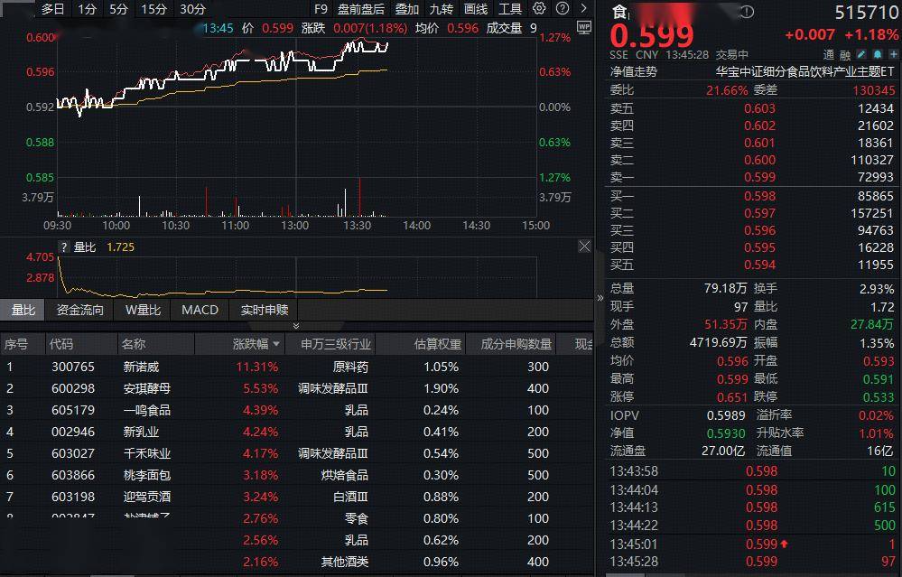 成份股方面,大众品涨幅居前,部分白酒股亦表现亮眼。截至发稿,安琪酵母大涨超5%,一鸣食品、新乳业、千禾味业涨超4%,桃李面包、迎驾贡酒跟涨超3%,贵州茅台、山西汾酒、洋河股份等亦小幅飘红。