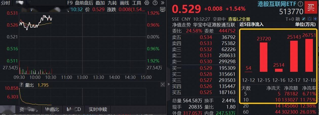 值得一提的是,此前回调区间,港股互联网ETF(513770)获资金密集涌入,上交所数据显示,港股互联网ETF(513770)10日连续吸金,合计获资金净流入13.3亿元。