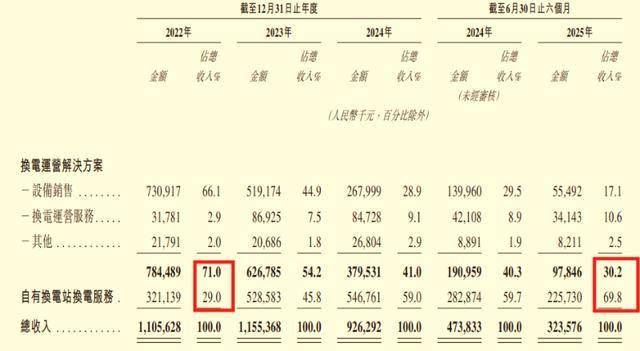 在发展初期,奥动的核心收入来源为换电设备销售。但后续公司业务重心逐步转向自营换电站的重资产模式。截至2025年上半年,奥动换电服务收入占比已跃升至69.8%,而设备销售收入占比则降至17.1%。