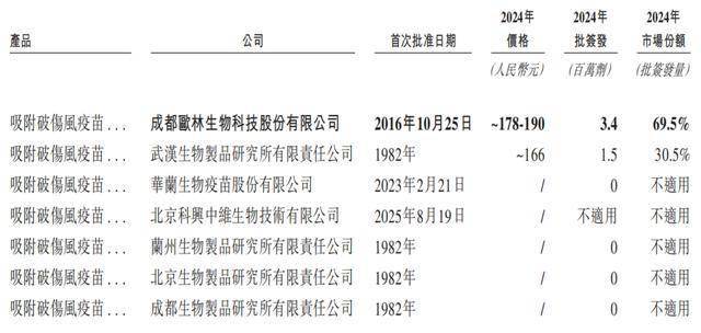不过欧林生物在吸附破伤风疫苗的统治地位正在被追赶。招股书显示,目前市面上共有7款吸附破伤风疫苗在售,按批签发量计算,欧林生物和武汉生物几乎分食了全部市场。