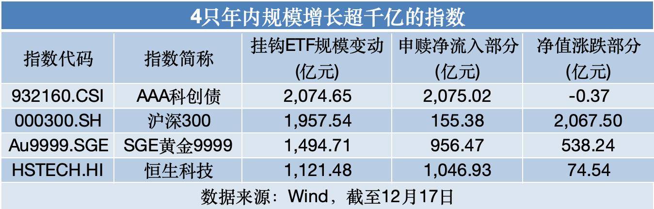 AAA科创债、恒生科技、SGE黄金9999的规模增长,主要由资金申购驱动,带来的增量分别为2075.02亿元、1046.93亿元、956.47亿元。