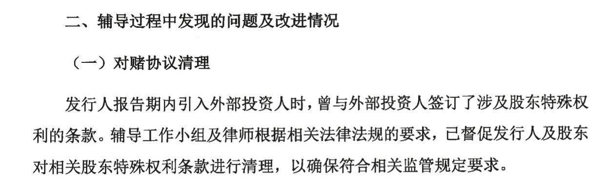 辅导报告中提到对赌协议清理,公司报告期内引入外部投资人时,曾与外部投资人签订了涉及股东特殊权利的条款。辅导工作小组及律师根据相关法律法规的要求,已督促公司及股东对相关股东特殊权利条款进行清理,以确保符合相关监管规定要求。