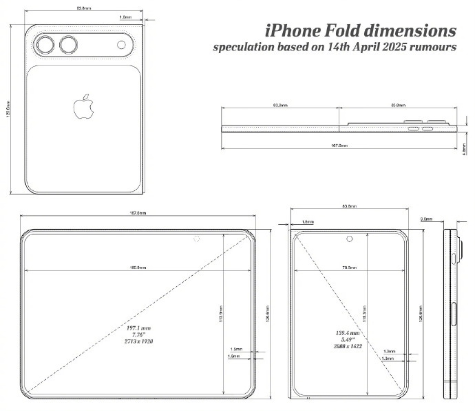 有科技媒体 iPhone-Ticker.de 分享了一组 CAD 渲染图,展示了苹果首款折叠屏手机 iPhone Fold,并标注了相关尺寸信息。长 120.6 毫米,比 Oppo Find N2 短 11.6 毫米,比 Pixel Fold 短 19.1 毫米。单侧宽度为 83.8 毫米,高最引人注目的是其厚度控制:展开状态下机身仅厚 4.8 毫米,即便折叠后也仅为 9.6 毫米。