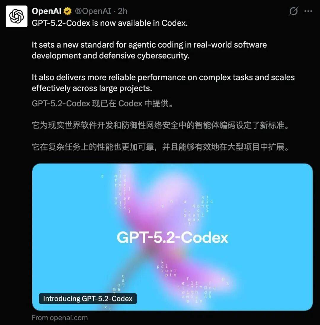 当地时间 12 月 18 日,OpenAI 发布 GPT-5.2-Codex,号称迄今为止最先进的智能编程模型,专为复杂现实场景的软件工程而设计。即日起,付费 ChatGPT 用户可在所有 Codex 界面使用 GPT-5.2-Codex,其正努力在未来几周内安全地向 API 用户开放访问。