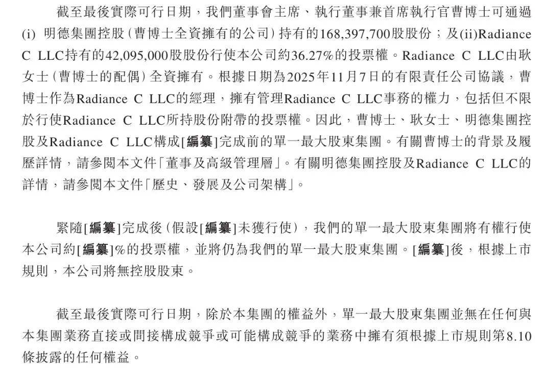 IPO前夕,曹国庆与妻子耿梅,加上二人控制的明德集团控股、Radiance C LLC,合计持有公司2.1亿股股份,对应持股比例(及投票权)达36.27%。