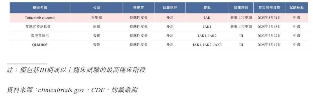 与此同时,普祺医药的普美昔替尼、Incyte/康哲药业的磷酸芦可替尼乳膏则处于第二梯队,目前正开展III期临床试验。