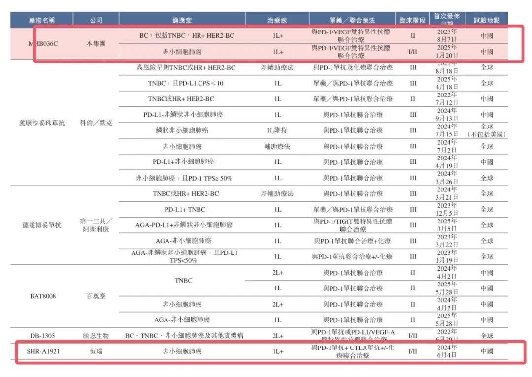 从在研产品来看,明宇制药的MHB036C与恒瑞医药的HR-A1921,均聚焦非小细胞肺癌一线及以上治疗赛道,尽管双方疗法设计存在显著差异,但因适应症、治疗线高度重合,二者已构成直接竞争关系。