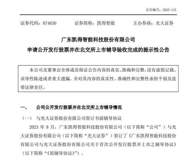 公告显示,凯得智能最初于2023年9月与光大证券签署辅导协议,原计划在深圳证券交易所主板上市。2025年9月,公司根据自身经营状况及未来发展规划,将上市目标板块变更为北交所。2025年12月19日,公司正式收到广东证监局出具的辅导验收完成函。