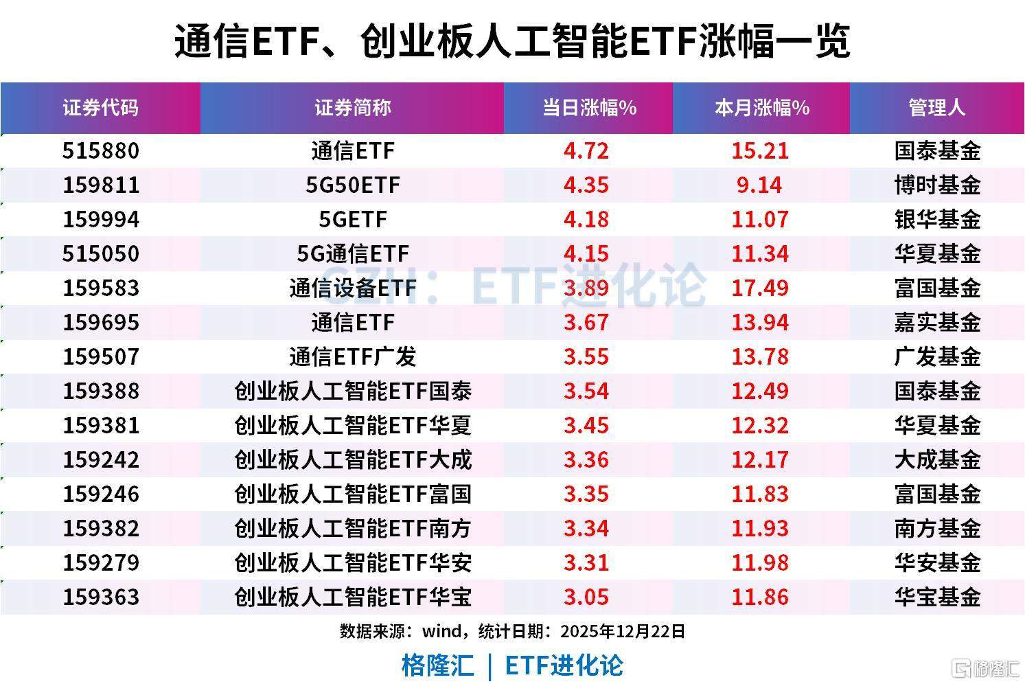 中际旭创涨超6%,天孚通信涨超4%,带动通信ETF、5G50ETF、5GETF、5G通信ETF涨超4%;通信设备ETF、通信ETF、通信ETF广发、创业板人工智能ETF国泰、创业板人工智能ETF华夏、创业板人工智能ETF大成、创业板人工智能ETF富国、创业板人工智能ETF南方、创业板人工智能ETF华安、创业板人工智能ETF华宝涨超3%。