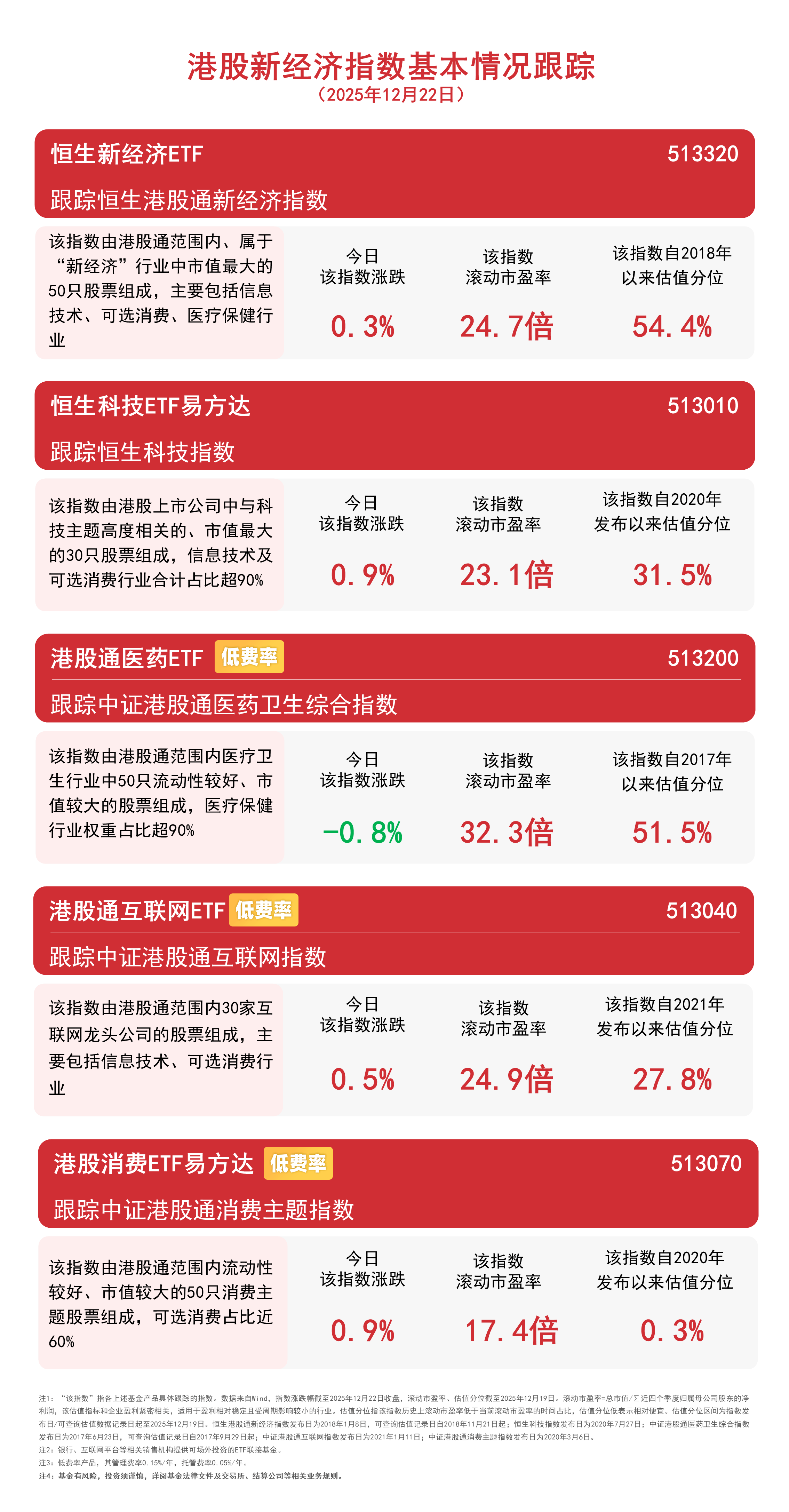 港股今日震荡分化,半导体、有色金属、消费等板块活跃,医药板块回调。截至收盘,恒生科技指数、中证港股通消费主题指数均上涨0.9%,中证港股通互联网指数上涨0.5%,恒生港股通新经济指数上涨0.3%,中证港股通医药卫生综合指数下跌0.8%。资金持续布局,Wind数据显示,恒生科技ETF易方达(513010)和港股通互联网ETF(513040)上周分别获9.2亿元和2.8亿元资金净流入。