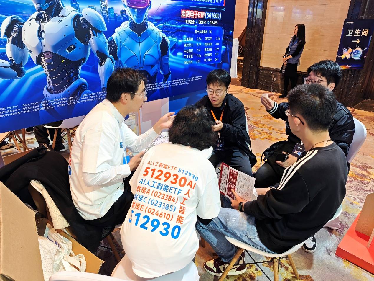 活动期间,平安基金展台整体设计简洁而富有科技感,紧扣“破局・重构” 主题,以蓝色为主色调,搭配动态电视屏滚动展示旗下重点行业主题ETF及公司公益支教项目相关视频,展板也特别展示了AI人工智能ETF(512930) 和消费电子ETF(561600) 等前沿科技赛道产品,吸引了大量投资者驻足了解。