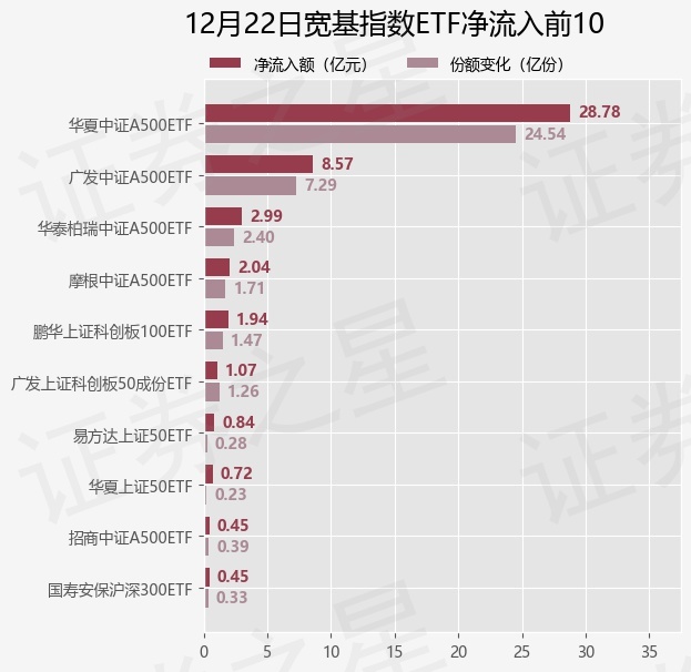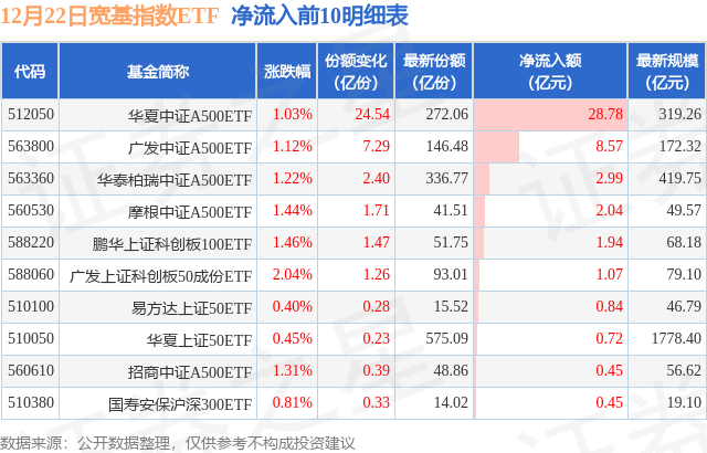 当日有22只宽基指数ETF基金出现资金净流入,其中净流入排首位的是华夏中证A500ETF(512050),份额增加了24.54亿份,净流入额为28.78亿元。