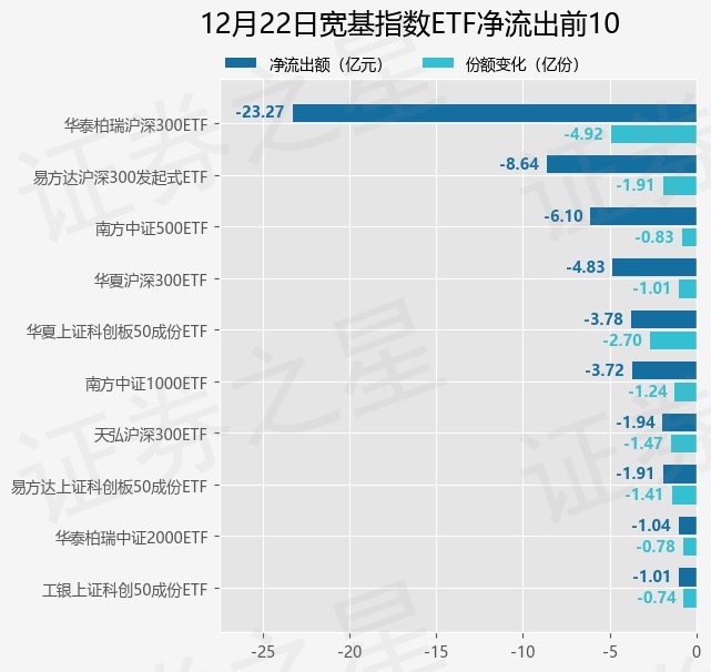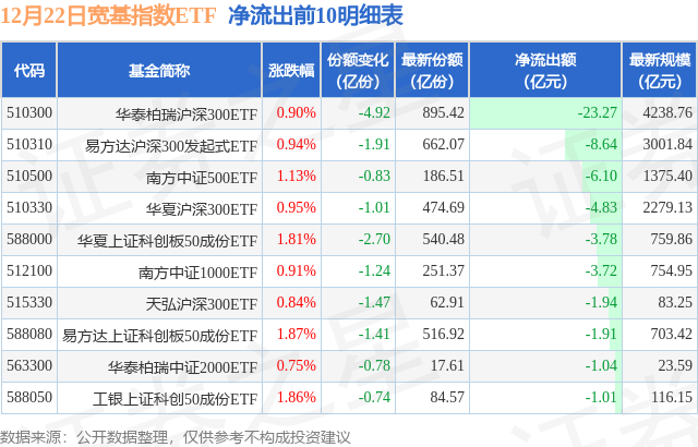 当日有83只宽基指数ETF基金出现资金净流出,其中净流出排首位的是华泰柏瑞沪深300ETF(510300),份额减少了4.92亿份,净流出额为23.27亿元。
