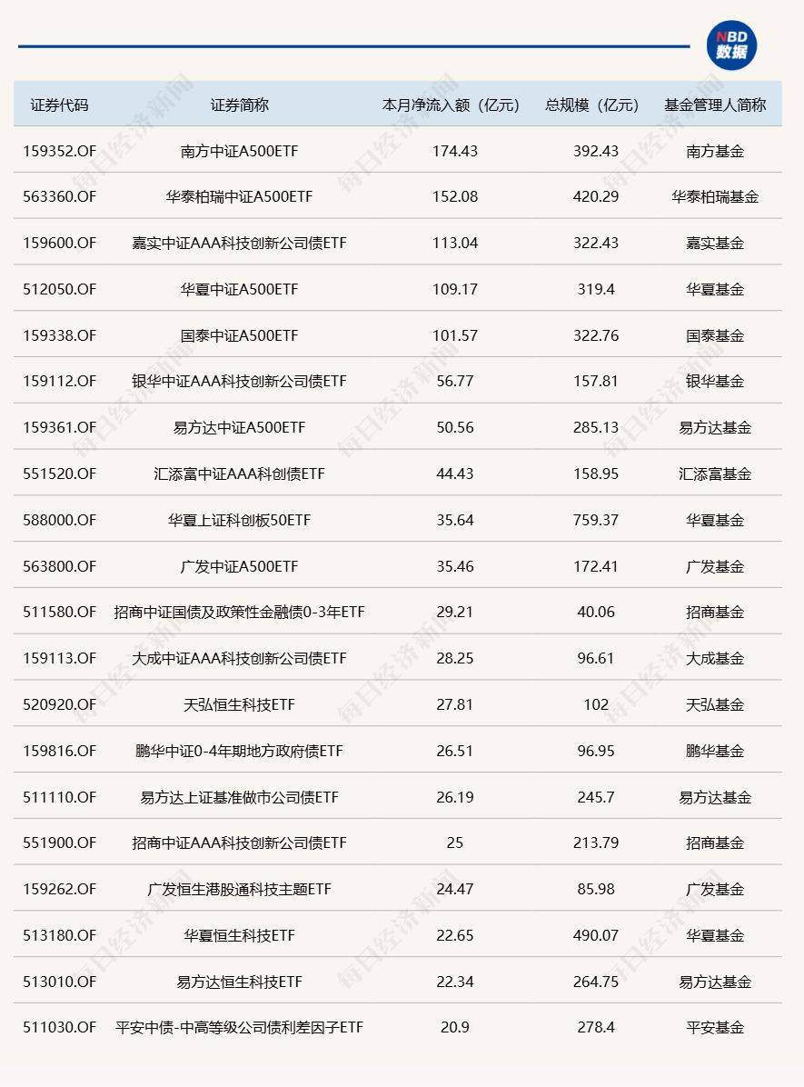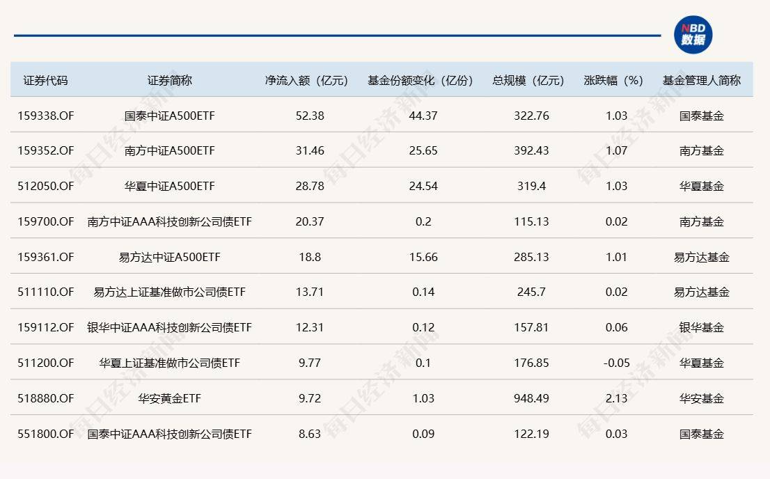 ETF规模速报 | 4只中证A500ETF,昨日净流入额合计超130亿元