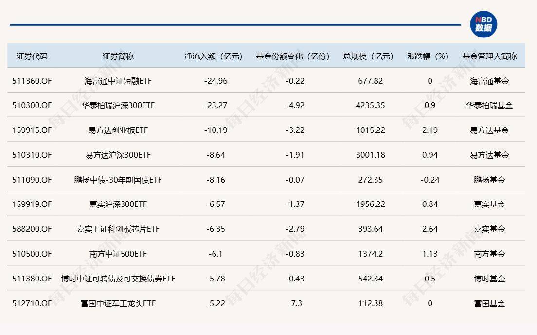 与此同时,海富通中证短融ETF基金份额减少0.22亿份,净流出额24.96亿元;华泰柏瑞沪深300ETF份额减少4.92亿份,净流出额23.27亿元;易方达创业板ETF份额减少3.22亿份,净流出额10.19亿元。