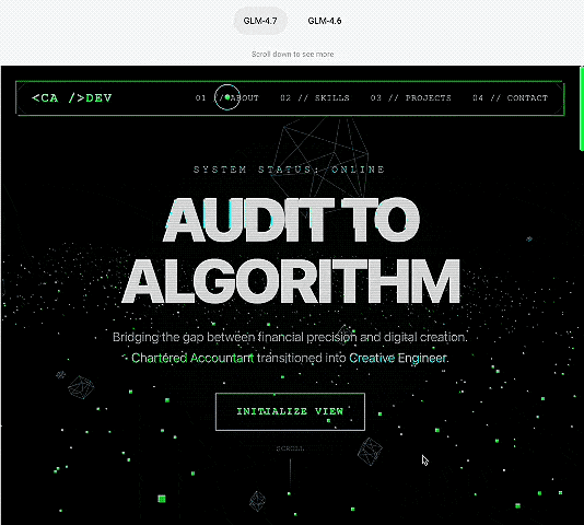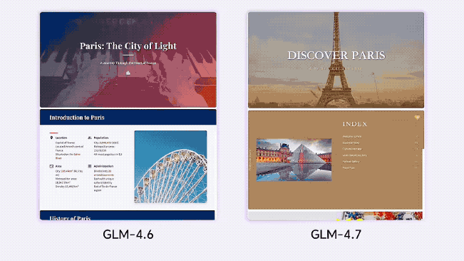 在前端生成质量上,GLM-4.7展现出明显升级:页面结构更干净、组件层级更清晰。