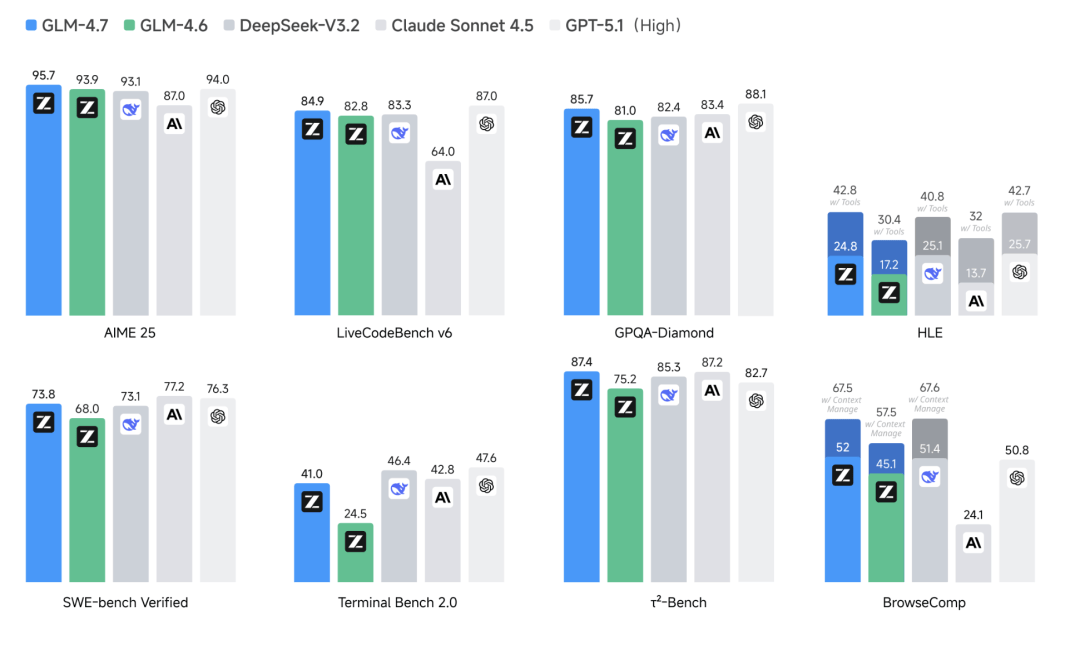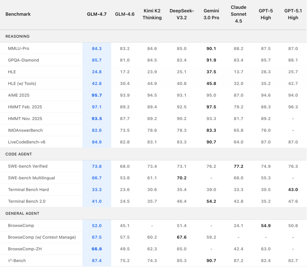 AIME 25和人类最后考试(HLE)等基准中,GLM-4.7分数超GPT-5.1;
