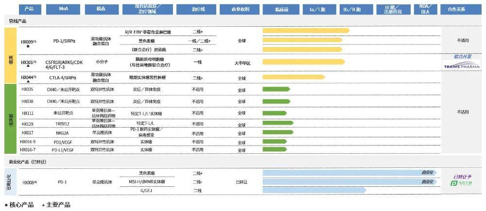 处于Ⅰ期临床的HX301是多靶点激酶抑制剂,靶向CSF1R、ARK5等关键通路,能穿透血脑屏障,目前推进与替莫唑胺联用治疗脑胶质母细胞瘤的Ⅱ期研究。7 款临床前产品则覆盖ADC、双特异性抗体、小分子抑制剂等类型,包括针对急性移植物抗宿主病的HX035、针对亚型淋巴瘤的HX111等。
