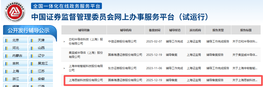 上证报中国证券网讯(记者 郑维汉)近日,证监会官网披露,上海思朗科技股份有限公司(简称“思朗科技”)在上海证监局办理辅导备案登记,启动IPO进程,辅导机构为国泰海通证券。