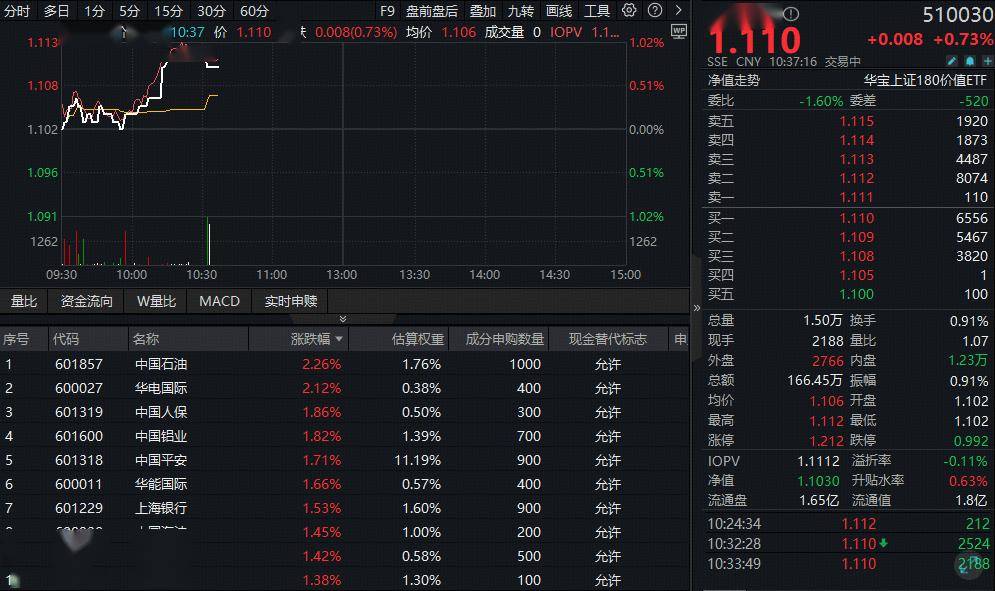 高股息风格个股今日(12月23日)表现强劲,聚焦“高股息+低估值”大盘蓝筹股的价值ETF(510030)盘中突然拉升,场内价格最高涨0.91%,截至发稿,涨0.73%。