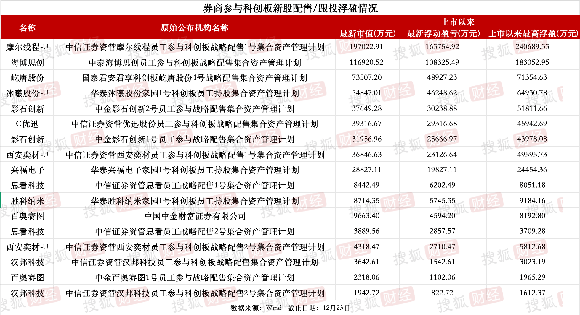 据Wind数据,截至12月23日,有5家券商旗下资管计划参与年内上市的科创板公司战略配售/跟投,上市以来最高浮盈超过70亿元,最新浮盈合计超过45亿元。