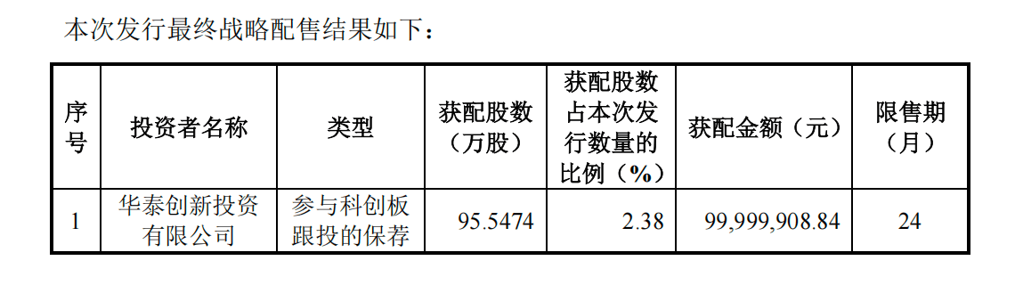 华泰联合证券子公司华泰创新参与本次发行战略配售,参与战略配售数量约95.5万股,占本次公开发行股份数量的2.38%,获配金额约1亿元,华泰创新本次跟投获配股票限售期2年。 以12月23日沐曦股份的收盘价667.60元/股计算,华泰创新配售股份最新市值6.38亿元,浮盈5.38亿元。