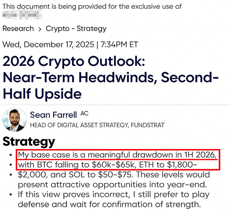 然而,当市场把目光从镜头前移向机构内部文件,画风出现反转:在 Tom Lee 创立的 Fundstrat 最新面向内部订阅客户的 2026 展望策略建议中,给出了相反的观点,其基准预测认为 2026 年上半年加密资产可能出现显著回撤,ETH 目标区间为 1800–2000 美元。这种“公开喊多”与“内部看空”的表述差异,也将 Tom Lee 本人与其关联机构推至舆论的风口浪尖。