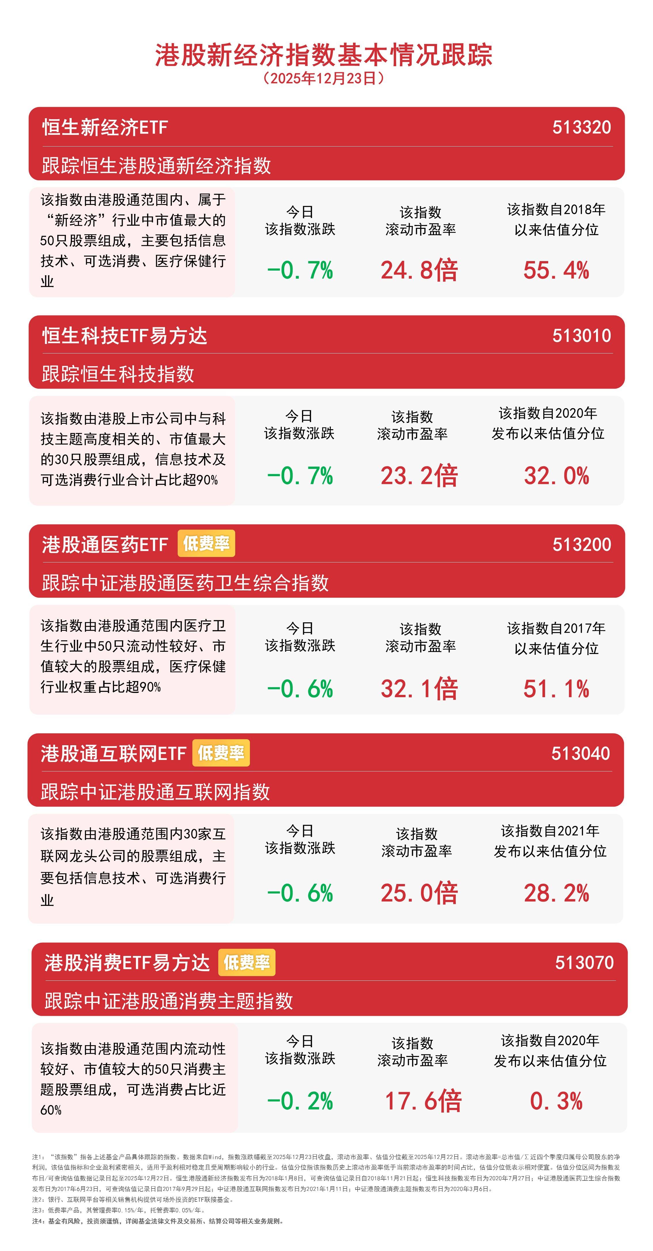 今日,港股早盘拉升后持续走弱。截至收盘,中证港股通消费主题指数下跌0.2%,中证港股通医药卫生综合指数、中证港股通互联网指数均下跌0.6%,恒生港股通新经济指数、恒生科技指数均下跌0.7%。相关ETF受资金青睐,截至昨日,恒生科技ETF易方达(513010)和港股通互联网ETF(513040)近一周分别获6.2亿元和3.6亿元资金净流入。