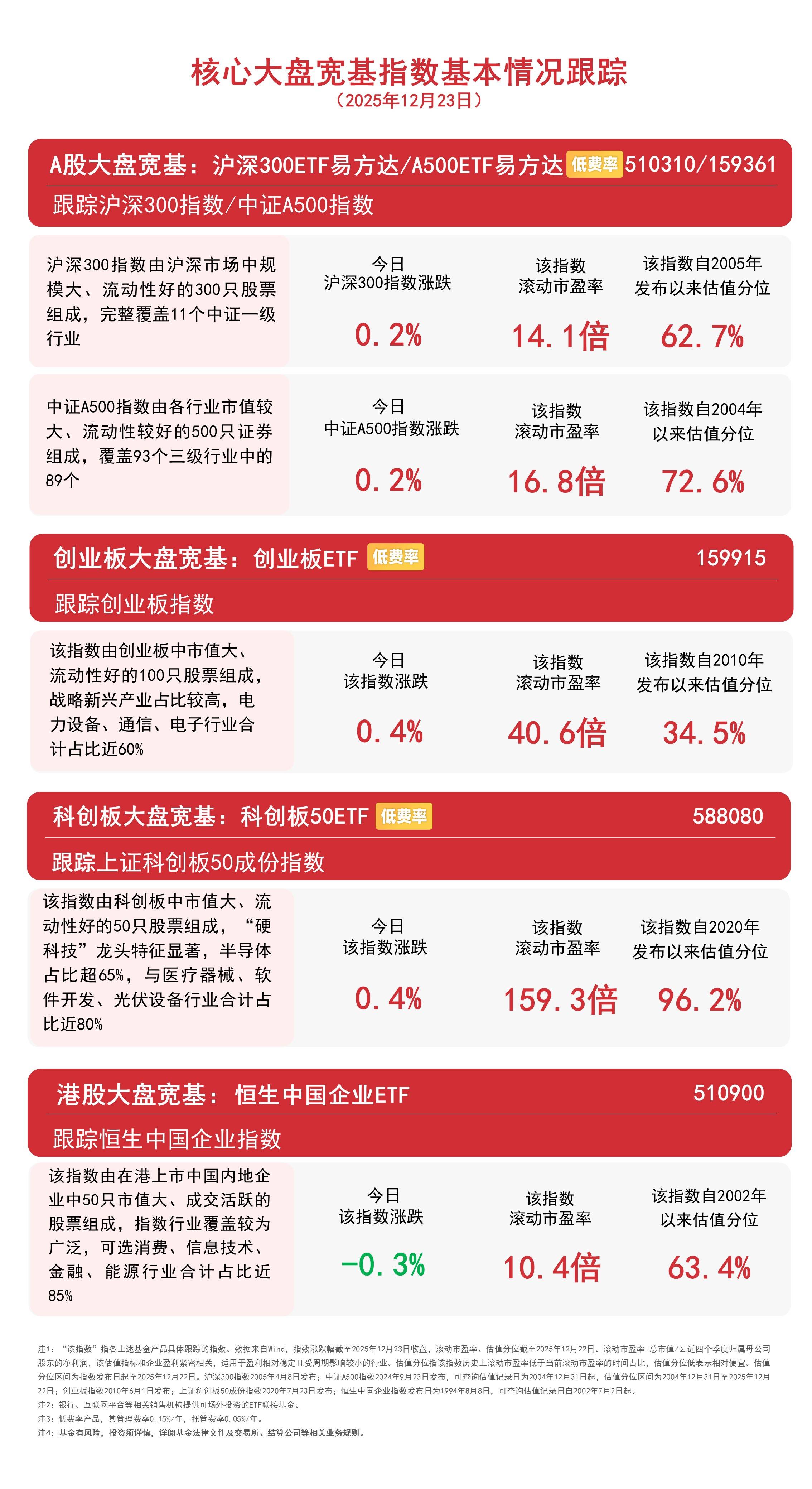 截至收盘,中证A500指数、沪深300指数均上涨0.2%,创业板指数、上证科创板50成份指数均上涨0.4%,恒生中国企业指数下跌0.3%。