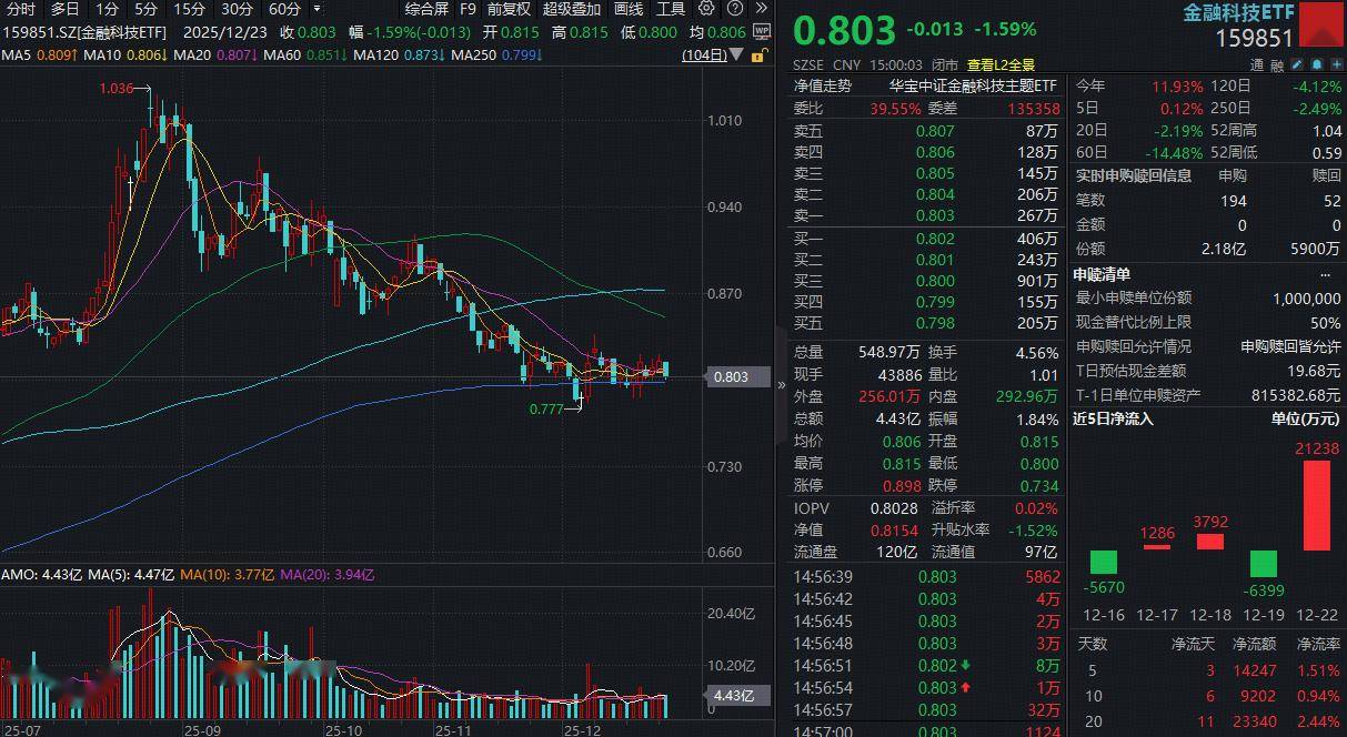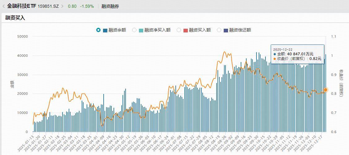 值得一提的是,行情横盘震荡之际,资金大举涌入。数据显示,前一日资金大买超2亿元后,金融科技ETF(159851)今日再获资金净申购1.59亿份!此外,杠杆资金近期也频繁加仓,12月22日金融科技ETF(159851)获融资净买入2400万元,最新融资余额回升至4亿元上方,逼近前高!