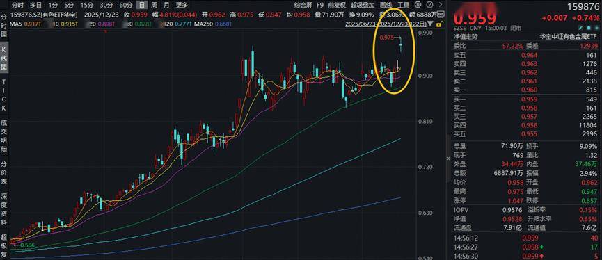 有色金属板块盘中表现活跃,一度领涨两市,同标的指数规模最大*的有色ETF华宝(159876)场内价格最高涨超2.3%,最终收涨0.74%,全天成交额6887万元,放量突破ETF上市以来的高点!