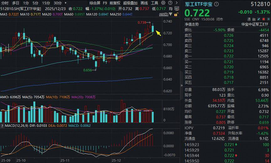 连涨四日后,军工板块迎来回调,场内高人气军工ETF华宝(512810)收跌1.37%止步四连阳,全天成交6396万元。昨日该ETF场内价格刚创下9月4日以来新高。