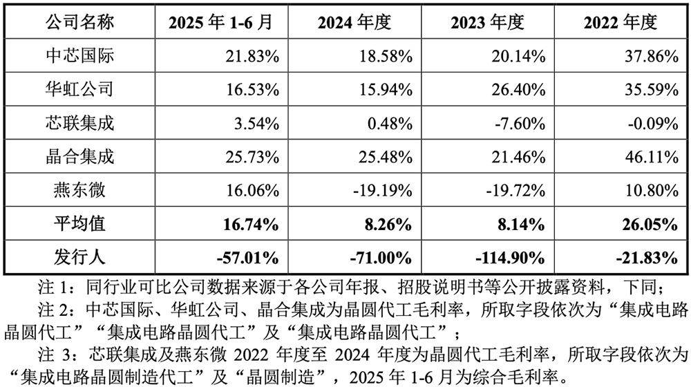 报告期各期,其主营业务收入均由晶圆代工业务构成,主营业务毛利率分别为-21.83%、-114.90%、-71.00%、-57.01%,主要受单位售价及单位成本变动影响,2024年以来主营业务毛利率已呈现快速改善趋势。