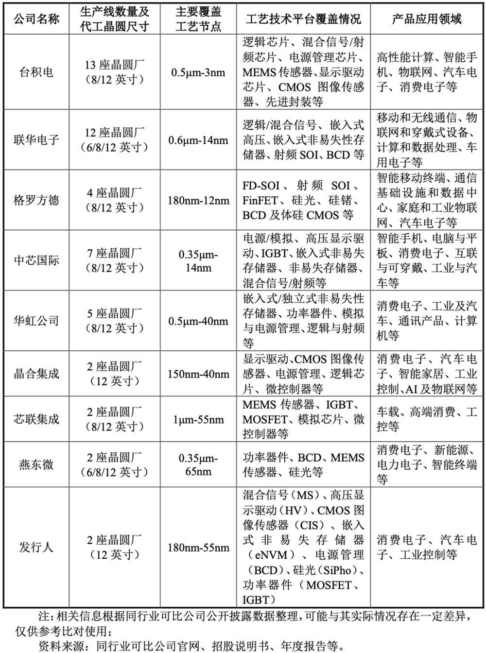 粤芯半导体与同行业可比公司在生产线数量及代工晶圆尺寸、主要覆盖工艺节点、工艺技术平台覆盖情况及产品应用领域等方面的对比情况如下:
