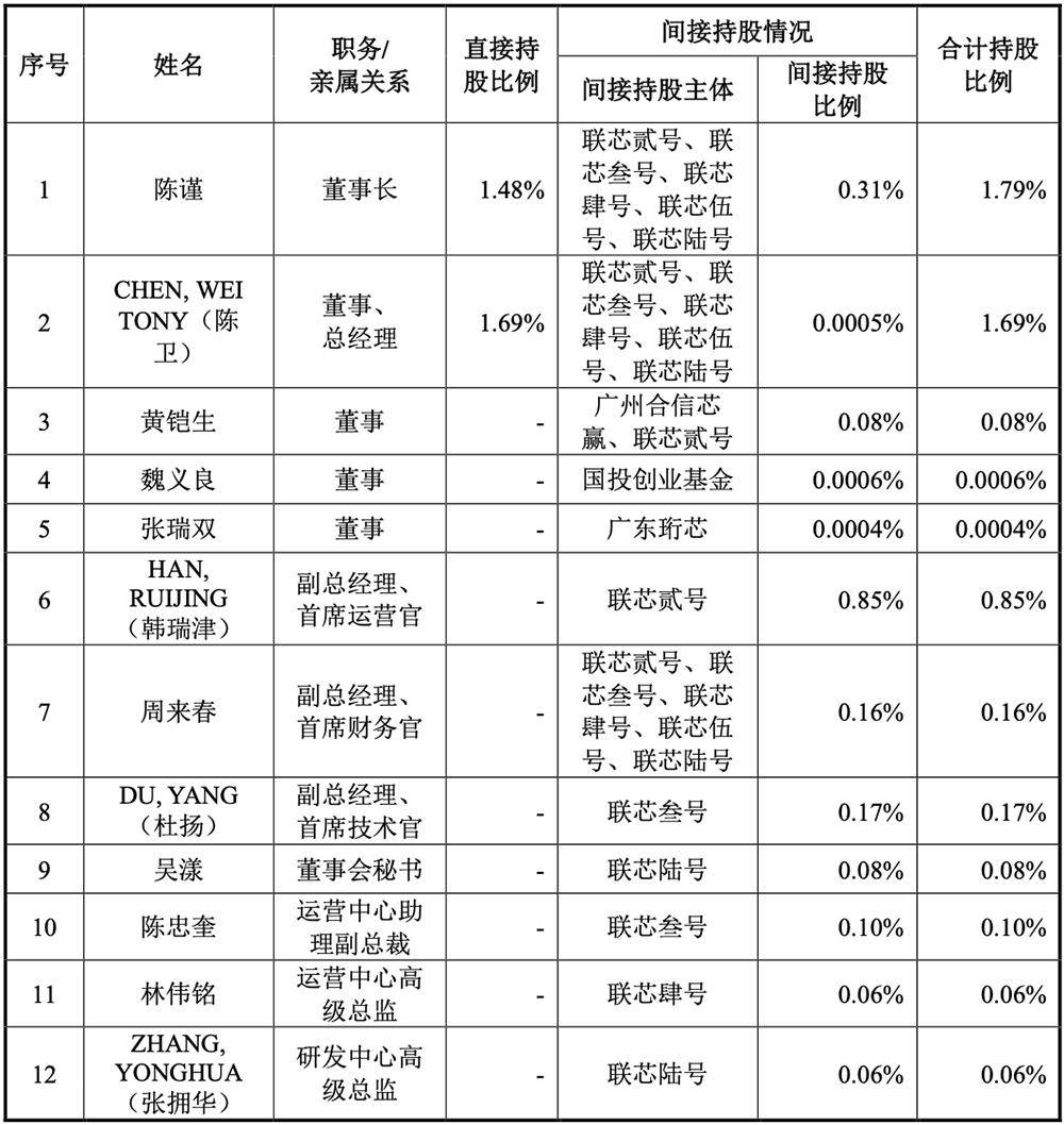 截至同日,其董事、高级管理人员、其他核心人员及其近亲属直接或间接持股的情况如下: