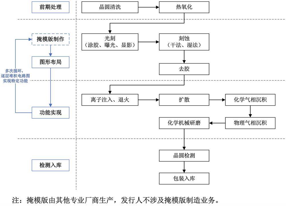 12英寸特色工艺晶圆代工的生产过程包括晶圆清洗、热氧化、光刻、刻蚀、去胶、离子注入、退火、扩散、化学气相沉积、物理气相沉积、化学机械研磨等环节,主要工艺流程如下: