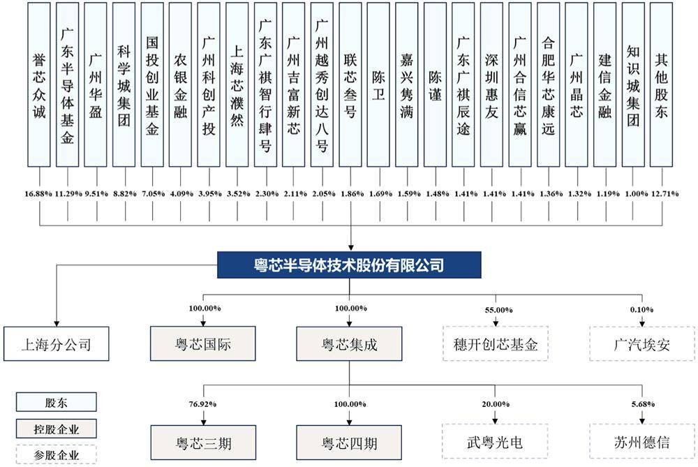 报告期内,其股权结构较为分散,持股5%以上的股东包括誉芯众诚、广东半导体基金、广州华盈、科学城集团、国投创业基金,持股比例分别为16.88%、11.29%、9.51%、8.82%、7.05%。