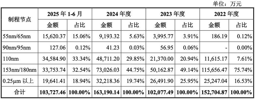 2022年、2023年、2024年、2025年1-6月,粤芯半导体为客户提供55nm/65nm、90nm/95nm、110nm、153nm/180nm、0.25µm以上多种工艺节点的晶圆代工业务。