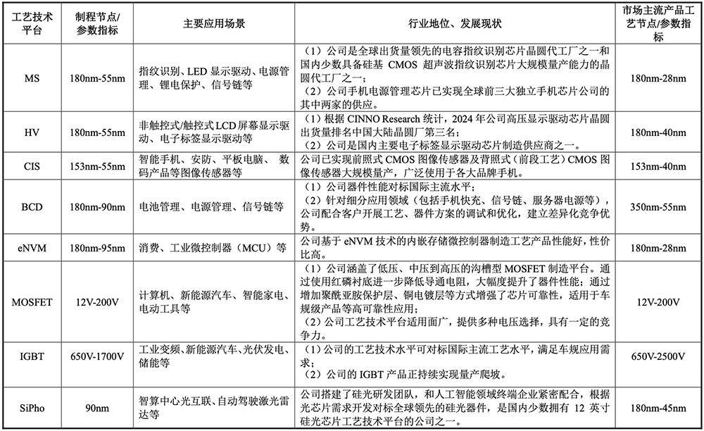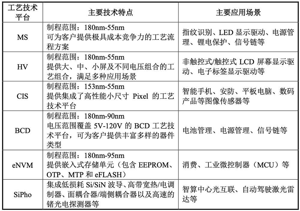 其工艺技术平台围绕应用于“感、传、算、存、控、显”等功能的模拟和数模混合芯片,逐步实现了多品类布局,已形成MS(混合信号)、 HV(高压显示驱动)、CIS(CMOS图像传感器)、BCD(Bipolar-CMOS-DMOS)、eNVM (嵌入式非易失存储器)、MOSFET(金属-氧化物-半导体场效应晶体管)、IGBT(绝缘栅双极型晶体管)、SiPho(硅光)等工艺技术平台,可应用于消费电子、工业控制、汽车电子、AI等领域。