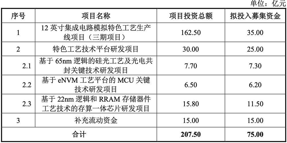 本次IPO,粤芯半导体拟募资75亿元,其中12英寸集成电路模拟特色工艺生产线项目(三期项目)拟使用募集资金35亿元,特色工艺技术平台研发项目拟使用募集资金25亿元,补充流动资金约15亿元。