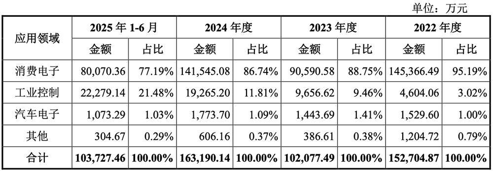 粤芯半导体的晶圆代工业务收入主要来源于消费电子领域,占主营业务收入的比例分别为95.19%、88.75%、86.74%、77.19%,总体保持稳定。