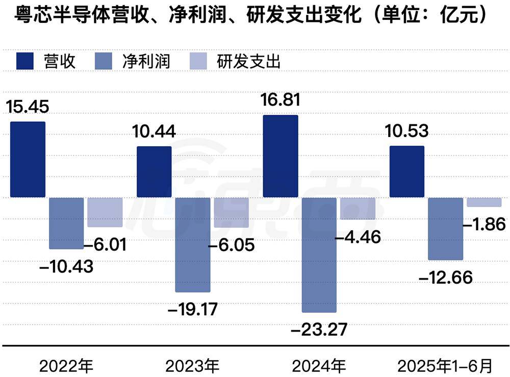 ▲2022年~2025年1-6月粤芯半导体营收、净利润、研发支出变化(智东西制图)